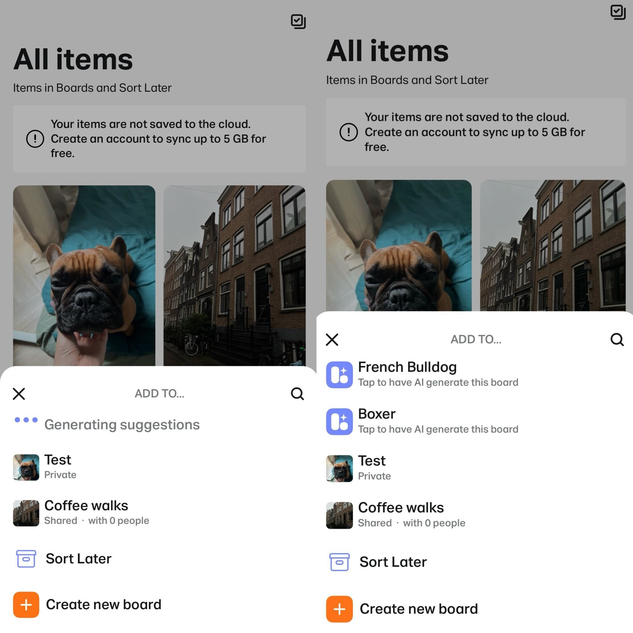 When you import images into Collect, our on-device image analysis attempts to recommend a board for you to add the image to. This image analysis uses AI to identify objects in the image and make board naming recommendations based on the objects in the image. Cool, huh? This identification happens 100% on your device and even works without an Internet connection.