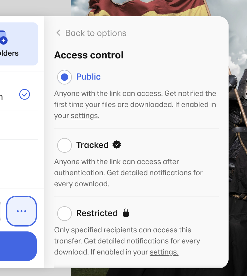 Our latest feature allows you to add an extra layer of security to your transfers. You can now set who can download your file and how you'll be notified. This gives you more control and peace of mind that your recipient is who they say they are.