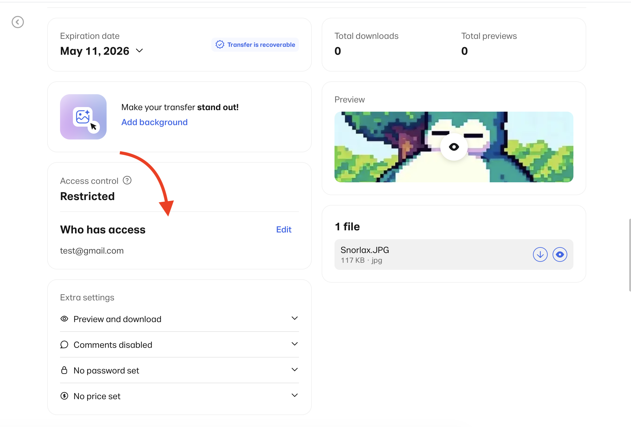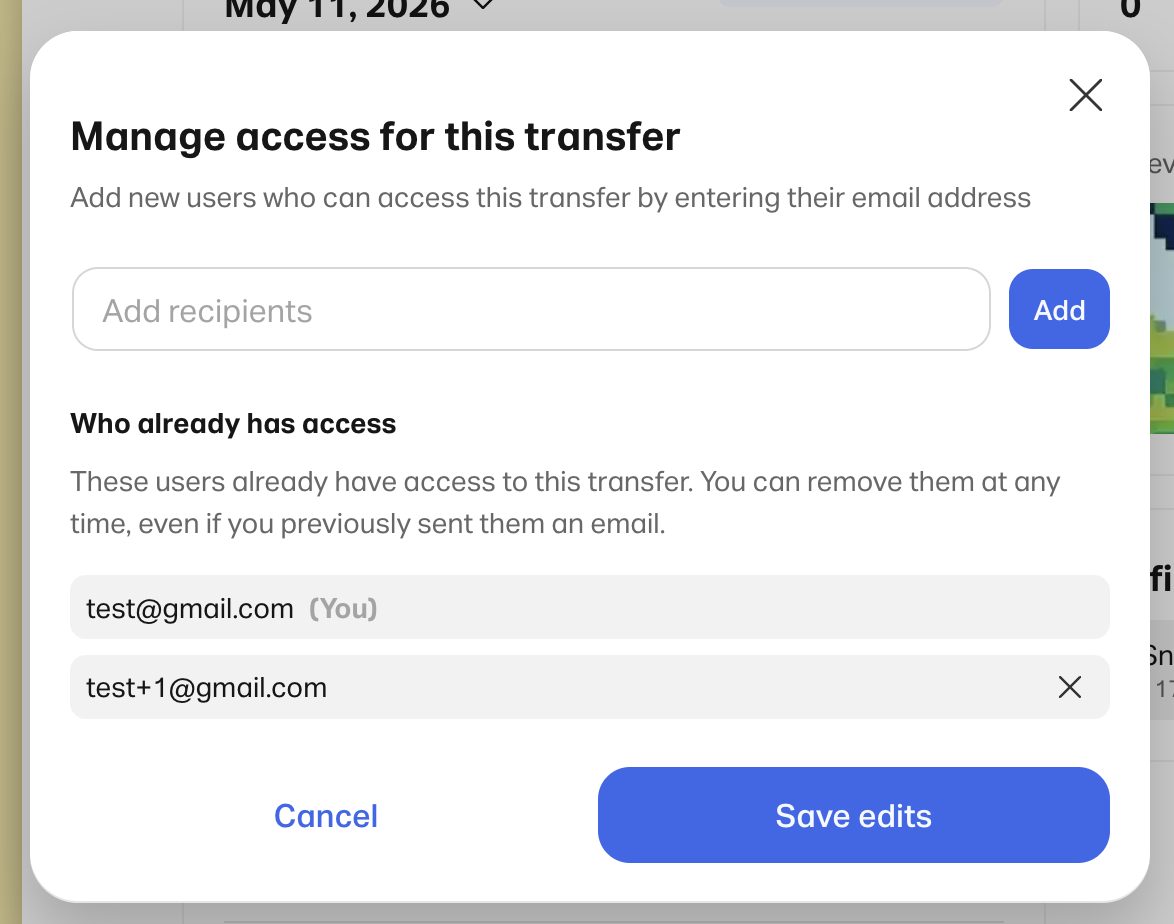 Changed your mind about who can access your transfer? You can add or remove people from the access list at any time from your transfer details page — no need to create a new transfer.