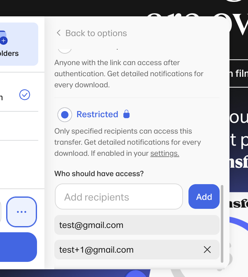 - Link transfers: When you select restricted downloads, you'll see a form where you can add the email addresses of the people you want to give access to. Add them one at a time before sending.