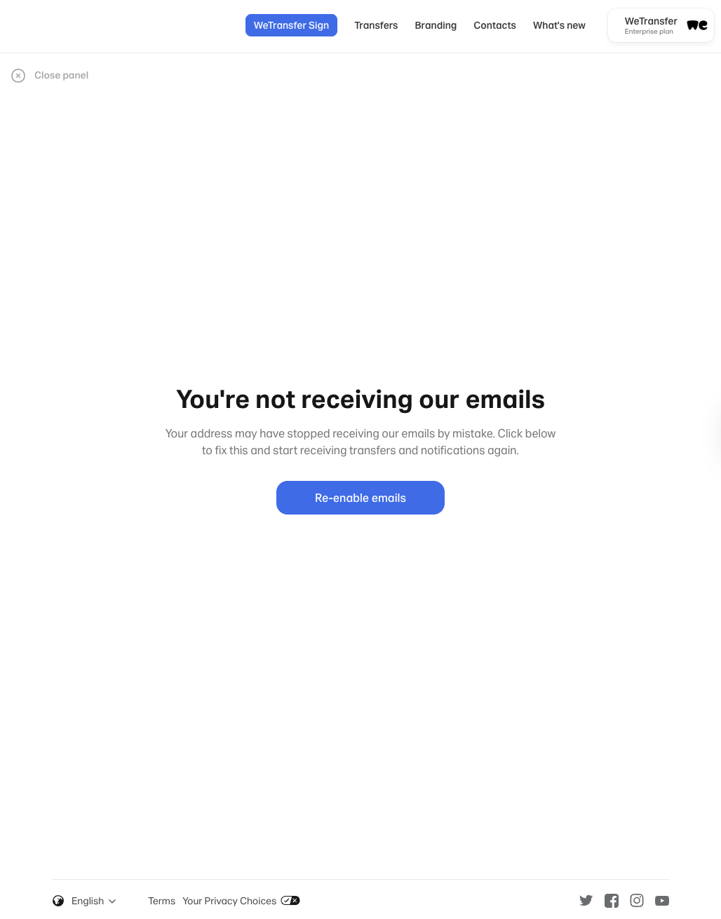 - Once re-enabled, you'll see a "You're back in" confirmation. You'll start receiving transfers and notifications from WeTransfer again right away.