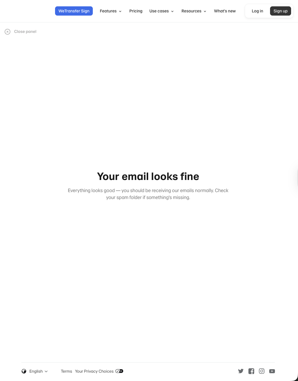 ⚠️ Note: If you see "Your email looks fine" after entering your address, your account isn't on the suppression list — you should be receiving our emails normally. If you're still not getting them, check your spam or junk folder, or check with your email provider in case WeTransfer emails are being filtered.