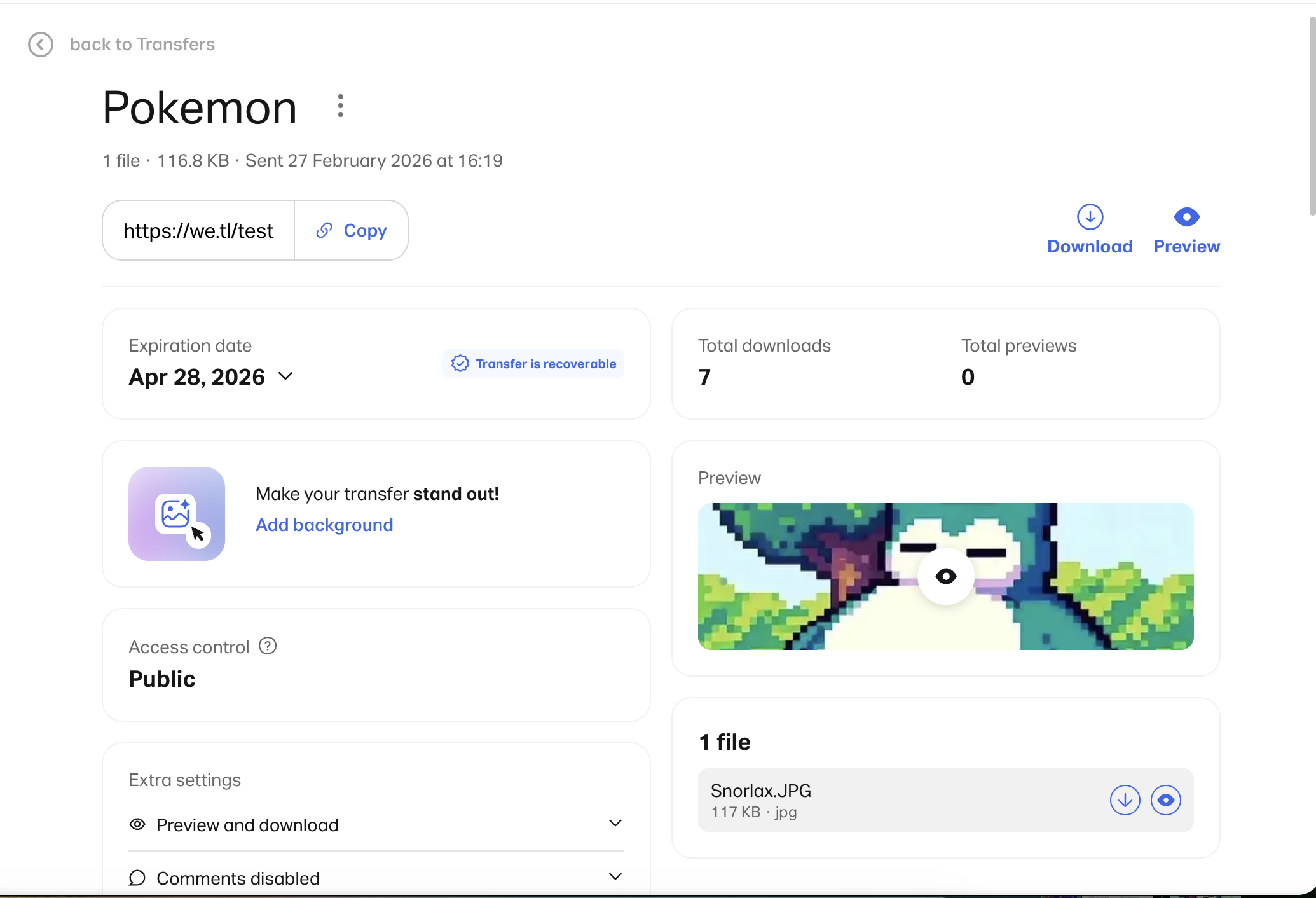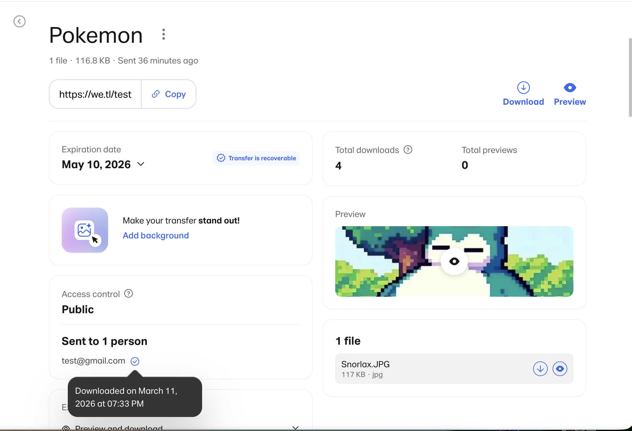 💡 Tip: For tracked and restricted transfers, you can see a full breakdown of exactly who downloaded your transfer. Check out How to Track Your Downloads with Download Verification for more details.